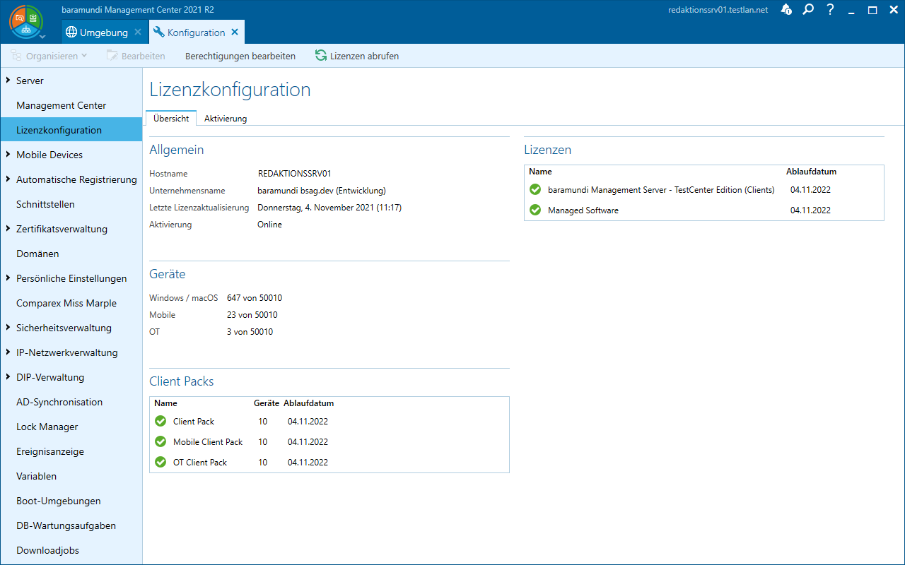 Die Ansicht Lizenzkonfiguration bietet im Reiter Übersicht Informationen zu Ihren Lizenzen. Um Lizenzen zu aktivieren, zu erweitern und zu erneuern, wechseln Sie in die Ansicht Aktivierung.