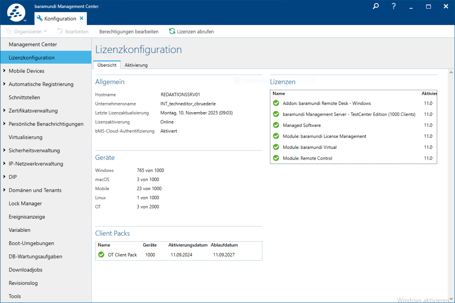 Um Lizenzen zu aktivieren, zu erweitern und zu erneuern, wechseln Sie in die Ansicht Aktivierung.
