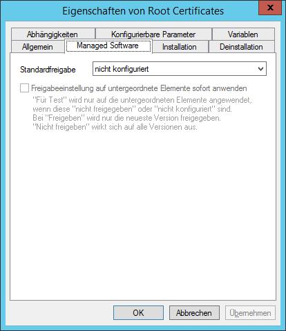 | Freigabeeinstellung auf untergeordnete Elemente sofort anwenden | Vererbt die unter Standardfreigabe getroffene Einstellung auf die unter der Produktlinie befindlichen Produktversionen |