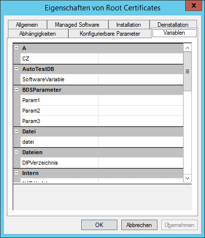 Es stehen Ihnen alle benutzerdefinierten Variablen des Bereichs Software zur Verfügung, die Sie unter Konfiguration > Variablen definiert haben. Die Variablen werden nach den konfigurierten Kategorien gruppiert.