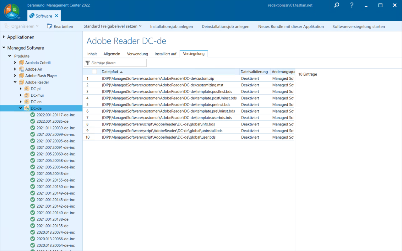| Dateivalidierung | Zeigt an ob die Prüfung für diese Datei durchgeführt wird. Eine Prüfung erfolgt nur, wenn die Versiegelungsprüfung auch global aktiviert wurde. Hinweis: Für das Aktivieren/Deaktivieren der Validierung an einem Hash benötigt man Modify-Rechte auf Konfiguration > DIP > Managed Software Datensicherheit oder auf Software > Managed Software > Produkte. |