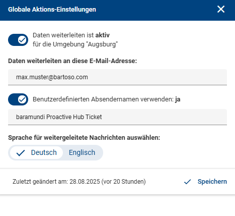 Entscheiden Sie mittels des zweiten Schiebereglers, ob Sie einen individuellen Absendernamen eingeben wollen. Standardmäßig ist als Absender „baramundi Proactive Hub Ticket“ eingetragen.