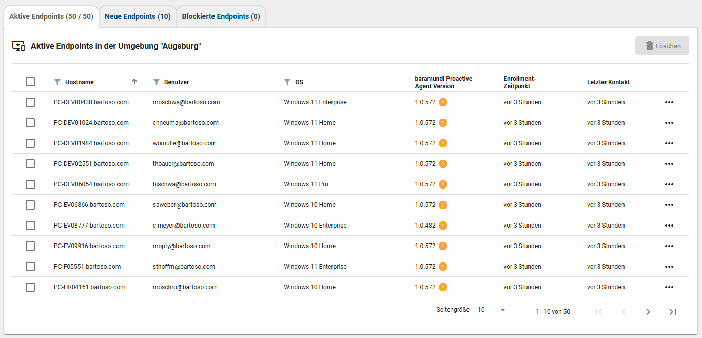 Alle Endpoints, auf denen der Agent erfolgreich installiert wurde, sind anschließend unter Neue Endpoints aufgelistet. Von dort wählen Sie alle gewünschten Endpoints aus und aktivieren Sie. Nach der Aktivierung ist der baramundi Proactive Agent auf diesen Endpoints aktiv und liefert Daten für jeden Endpoint an baramundi perform2work. Sind Endpoints im Rahmen des Enrollments bereits bekannt, siehe unten Re-Enrollment bereits bekannter Endpoints.