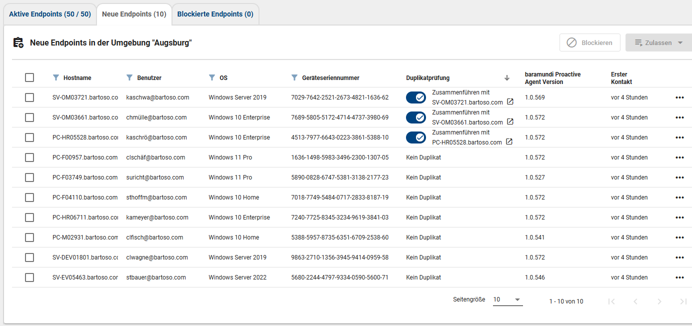Möchten Sie einen bereits bekannten Endpoint noch einmal neu im System aufnehmen, dann installieren Sie auf dem Gerät zuerst den baramundi Proactive Agent neu (Ablauf s. oben). Das System erkennt, ob ein Endpoint mit demselben Hostnamen bereits aufgenommen ist. Im Reiter Neue Endpoints sehen Sie dies anhand der Spalte Duplikatprüfung. Falls der Endpoint als Duplikat erkannt wurde, haben Sie hier die Möglichkeit, beide Duplikate zusammenzuführen (zu mergen) oder beide separat im System zu führen (standardmäßig ist Zusammenführen aktiviert). Über das Icon In neuem Browser-Tab öffnen können Sie sich die Details des zu mergenden Endpoints ansehen.