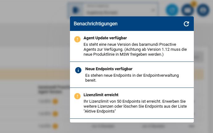 Mit entsprechender Administrationsberechtigung sehen Sie beim Öffnen der perform2work-Oberfläche Hinweise zu neuen und/oder veralteten Endpoints sowie zu veralteten Agent-Versionen im Notification-Center.