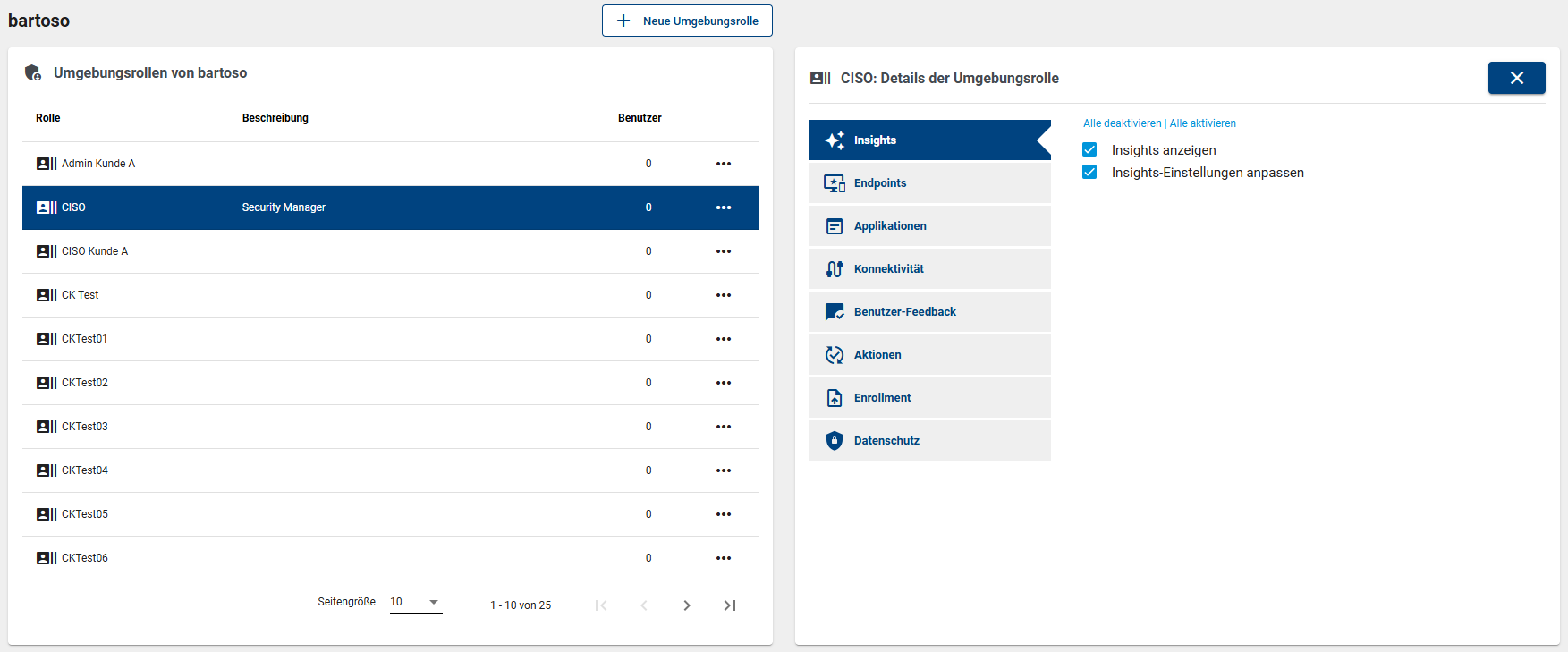 Insights: Wählen Sie, ob die Insights für diese Umgebungsrolle (den Nutzer) sichtbar sein sollen (Insights anzeigen) und/oder ob der Nutzer die Insights-Einstellungen anpassen können soll. Standard-Einstellungen sind wie folgt:
