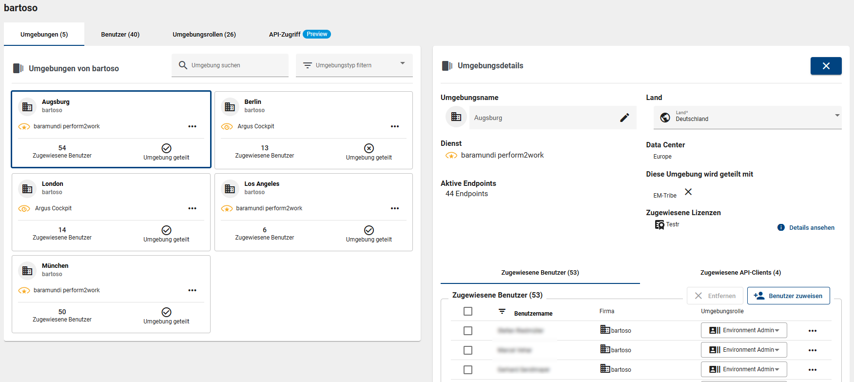 Die Übersichtsseite zeigt Ihnen für die gewählte Firma alle Umgebungen, Benutzer und Umgebungsrollen in den entsprechenden Reitern. Zum Thema Rollen siehe auch weiter unten „Umgebungsrollen“.