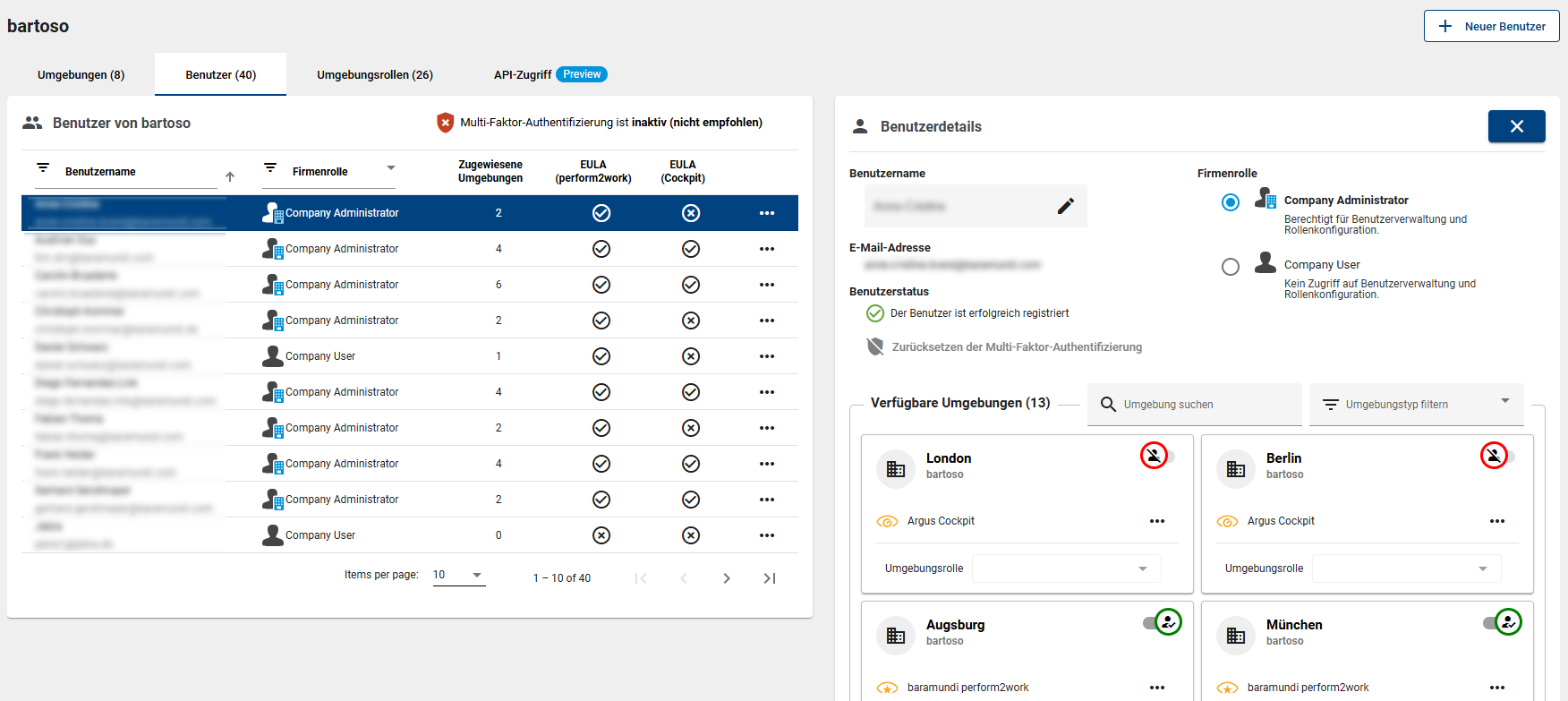 Die bereits angelegten Benutzer sehen Sie unter Umgebungen, nach Umgebung aufgeteilt, oder unter dem Reiter Benutzer in der Gesamtübersicht. Hier werden alle für die Firma angelegten Nutzer gelistet (links). Auf der Rechten Seite sehen Sie die Benutzerdetails für den gewählten Nutzer (ähnlich den Umgebungsdetails). Nehmen Sie hier alle Änderungen vor, wie beispielsweise: neue Umgebungen freigeben, Firmenrolle ändern, Umgebungen zeitweise deaktivieren und mehr.
