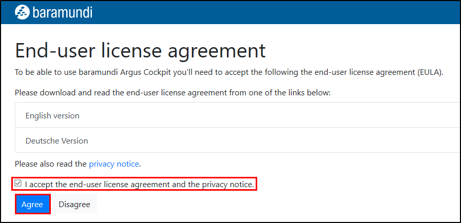 Zustimmen zum Endbenutzer-Lizenzvertrag (EULA): Um das baramundi Argus Cockpit nutzen zu können, ist es erforderlich dem Endbenutzer-Lizenzvertrag (EULA) zuzustimmen.