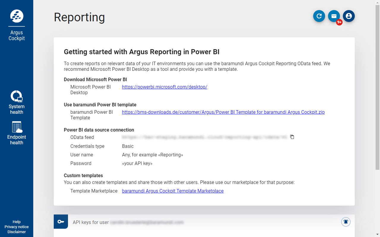 Für den Import der Argus-Daten in Microsoft Power BI muss sich der Benutzer mit einem API-Schlüssel authentifizieren. Öffnen Sie dazu Ihr Argus Cockpit-Dashboard. Den API-Schlüssel erstellen Sie über die Profilansicht > Reporting.