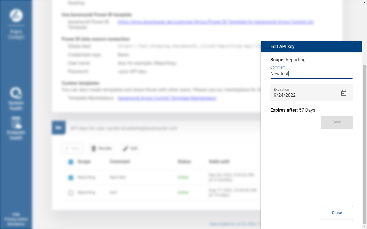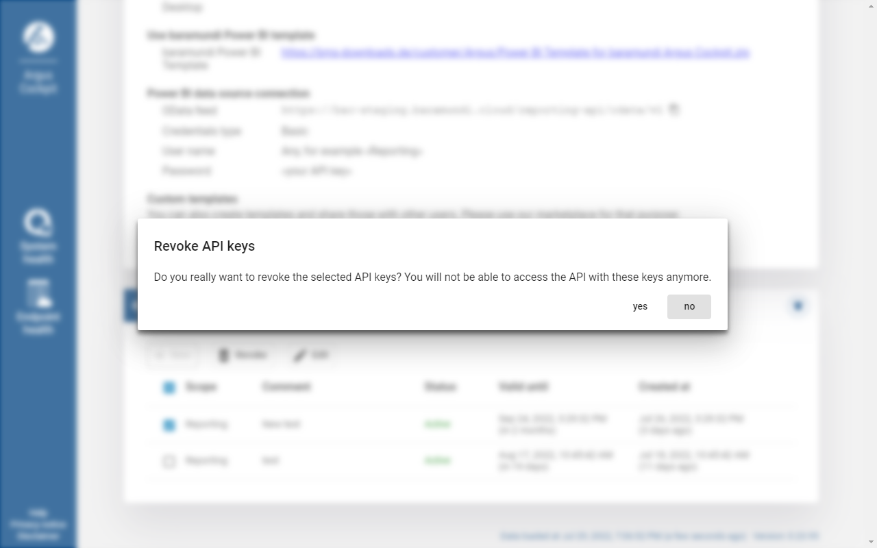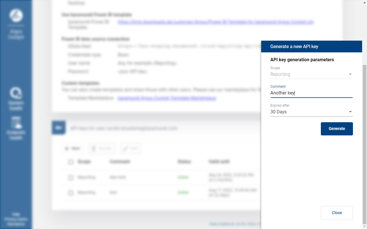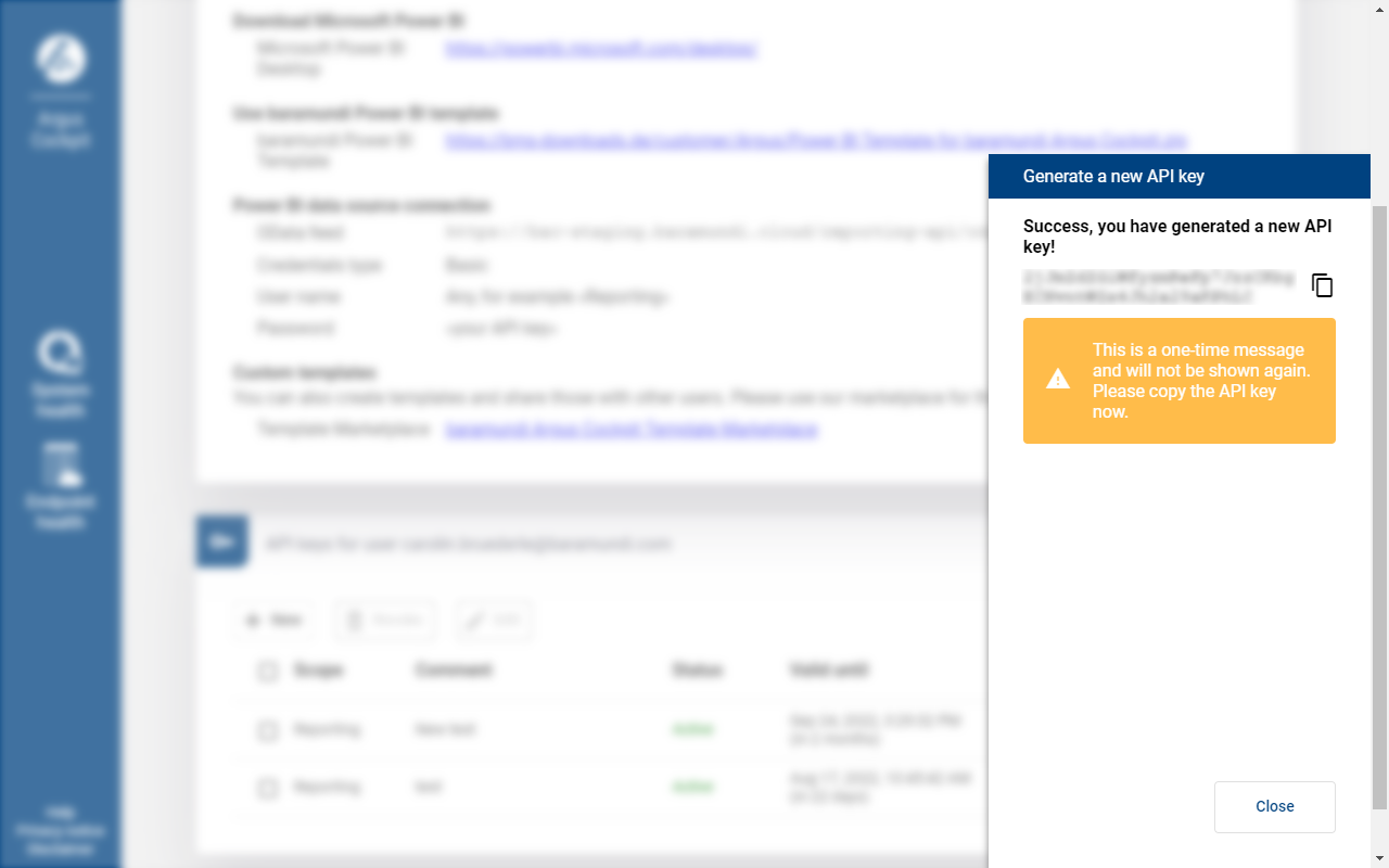 Kopieren Sie den API-Schlüssel und behandeln Sie ihn wie ein Kennwort, indem Sie den Schlüssel sicher speichern (z.B. mittels eines Passwort-Managers). Er wird in einem späteren Schritt im Reporting-Tool zum Verbindungsaufbau zu Argus benötigt. |