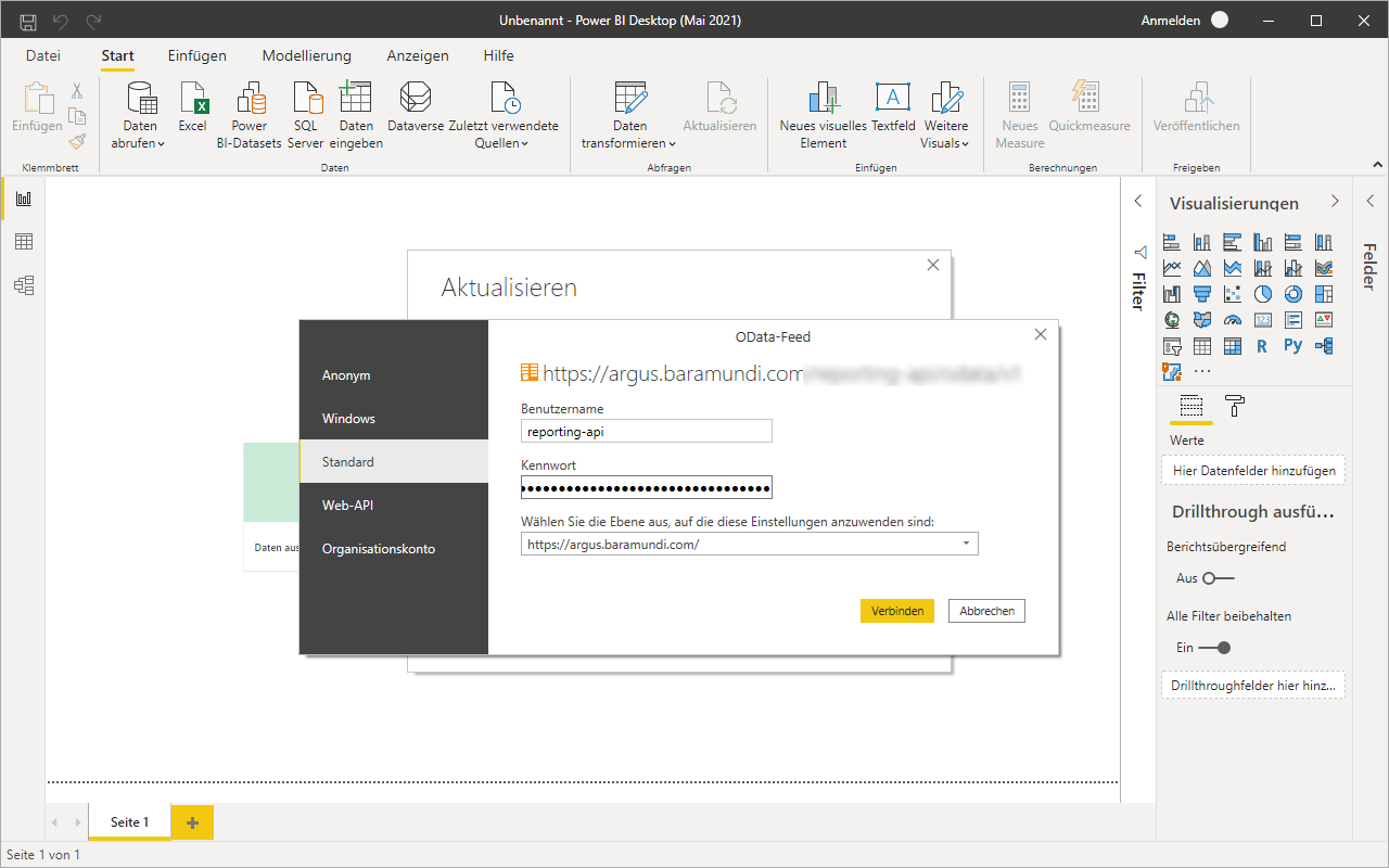 Die Authentifizierungsmaske öffnet sich; wählen Sie hier Standard aus: der User name ist beliebig wählbar, als Password fügen Sie den Reporting API-Key aus Argus Cockpit ein. Den Vorschlag für das Select level können Sie übernehmen. Klicken Sie im Anschluss auf Verbinden.