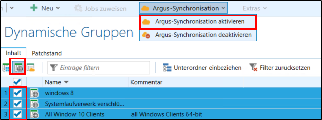 UDG erstellen und Synchronisierung aktivieren: Im bMC, im Knoten Umgebung > Dynamische Gruppen können Sie eine neue Dynamische Gruppe (Universell) erstellen. Bereits erstellte UDGs können Sie sich über den Tab Inhalt (UDG) anzeigen lassen. Dort wählen Sie maximal zehn Gruppen aus und führen anschließend die Synchronisierung via Argus-Synchronisation aktivieren aus. Über Argus-Synchronisation deaktivieren lassen sich UDGs entfernen und damit nicht mehr nach Argus Cockpit synchronisiert.