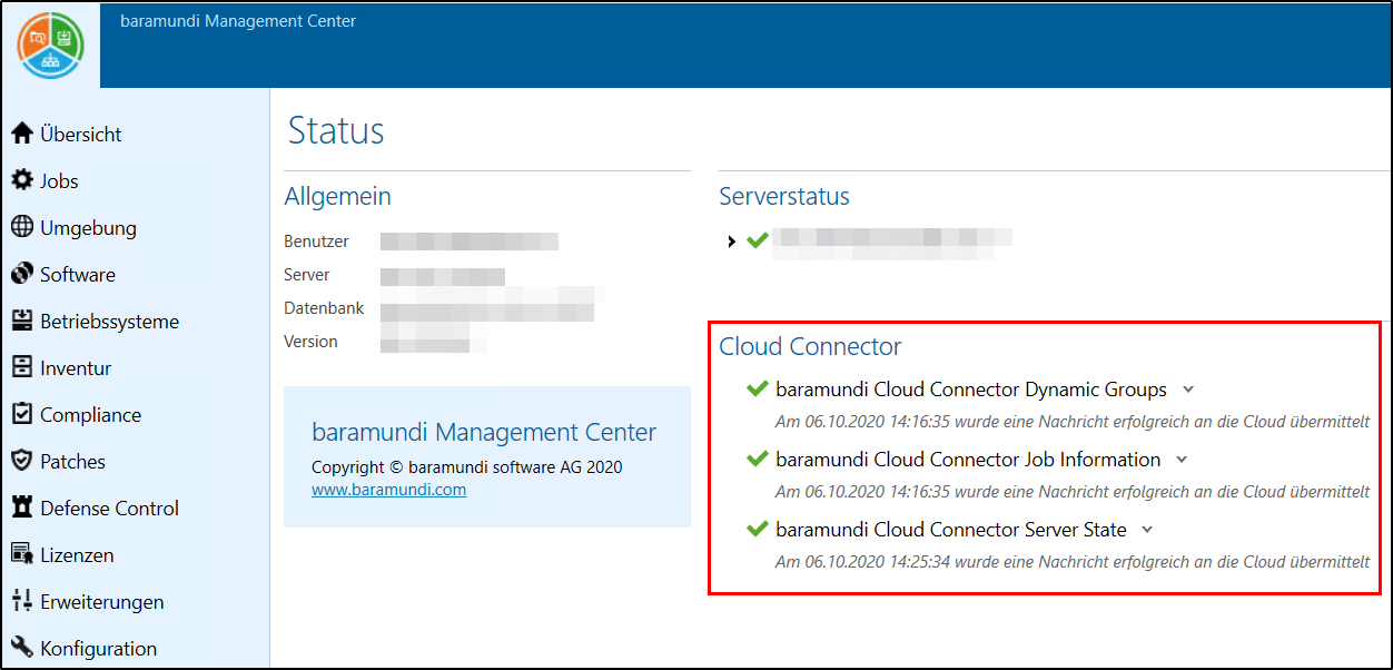 Der baramundi Cloud Connector Server State überträgt den Serverstatus des bServers, sowie den Status und Informationen der bServer-Dienste.
