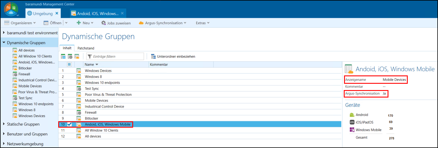 Für eine bessere Übersichtlichkeit werden synchronisierte UDGs mit einem eigenen Symbol in der bMC dargestellt. Die Eingabe eines UDG-Anzeigenamens (in diesem Beispiel: Mobile Devices) hilft bei der Erkennung im Argus Cockpit Dashboard.