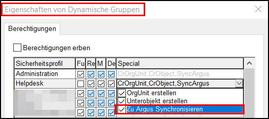 Berechtigungen für den bMC-Benutzer: Um nicht jedem bMC-Benutzer diese Synchronisation zu ermöglichen, können Sie berechtigten Nutzern das Spezialrecht Zu Argus synchronisieren in den Eigenschaften von dynamische Gruppen hinzufügen.