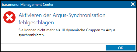 Beim Versuch mehr als zehn UDGs nach Argus zu synchronisieren, wird für die überzähligen Gruppen eine Benachrichtigung angezeigt. Die Lösung zu diesem Problem wird hier erklärt: KB107120 - Argus Cockpit - Synchronisation von mehr als 10 Gruppen nicht möglich.