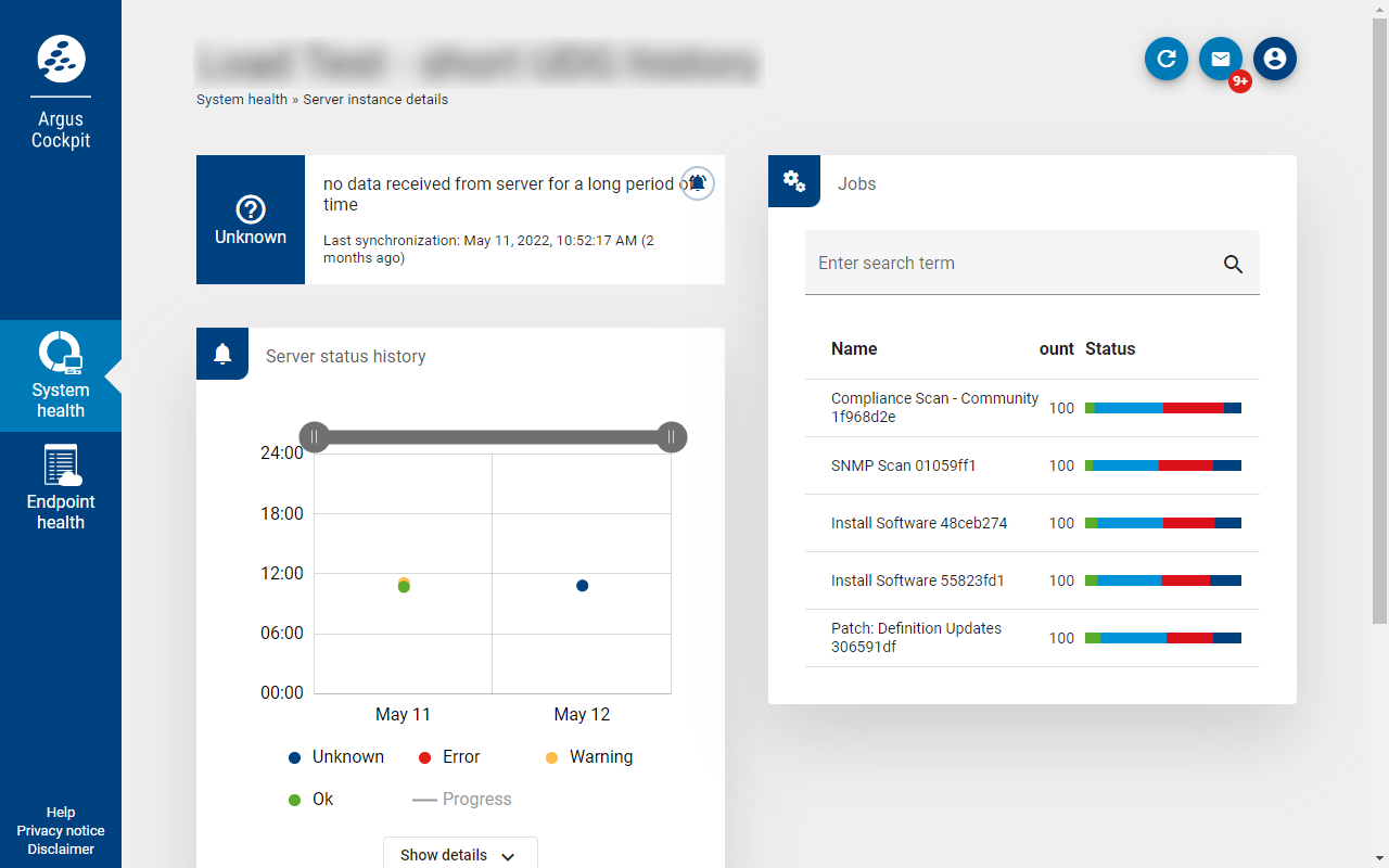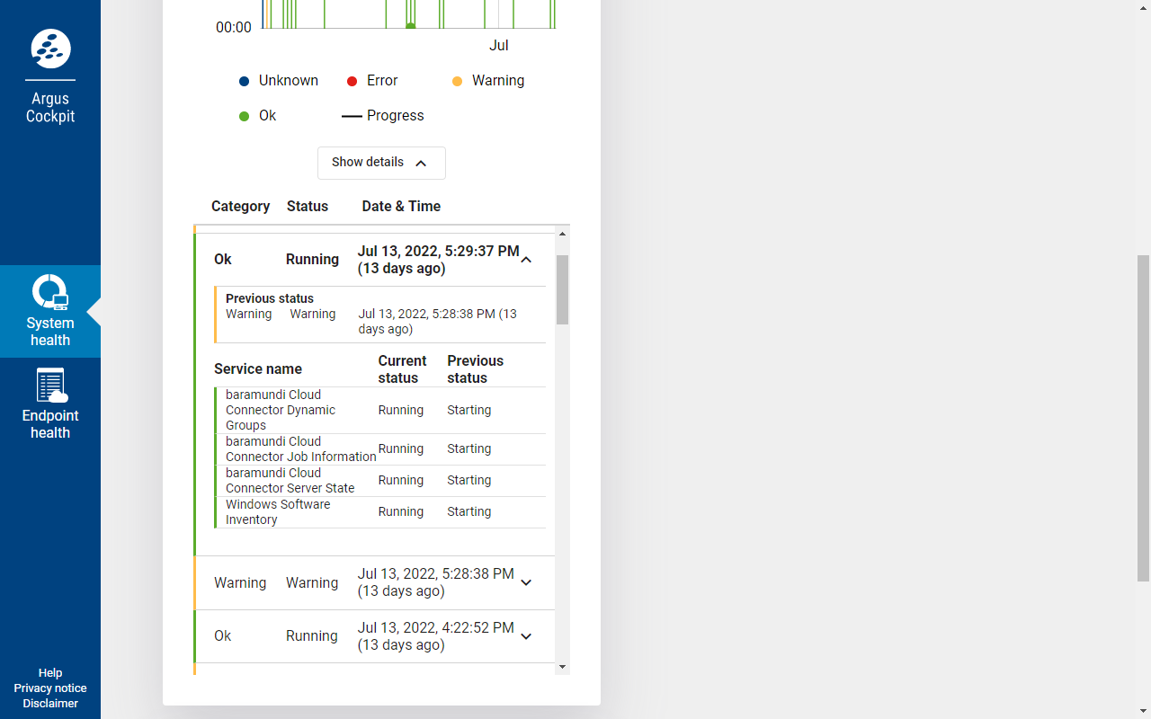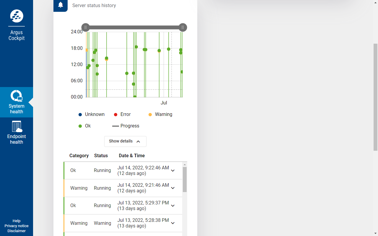 Über die Server Status Historie sehen Sie einen Überblick über alle in der Datenbank gespeicherten Serverstatusänderungen. Die Änderungen sind durch ein Punktdiagramm dargestellt und können von dort über einen Klick direkt angesteuert werden. Die Details lassen sich auch über Show details öffnen.