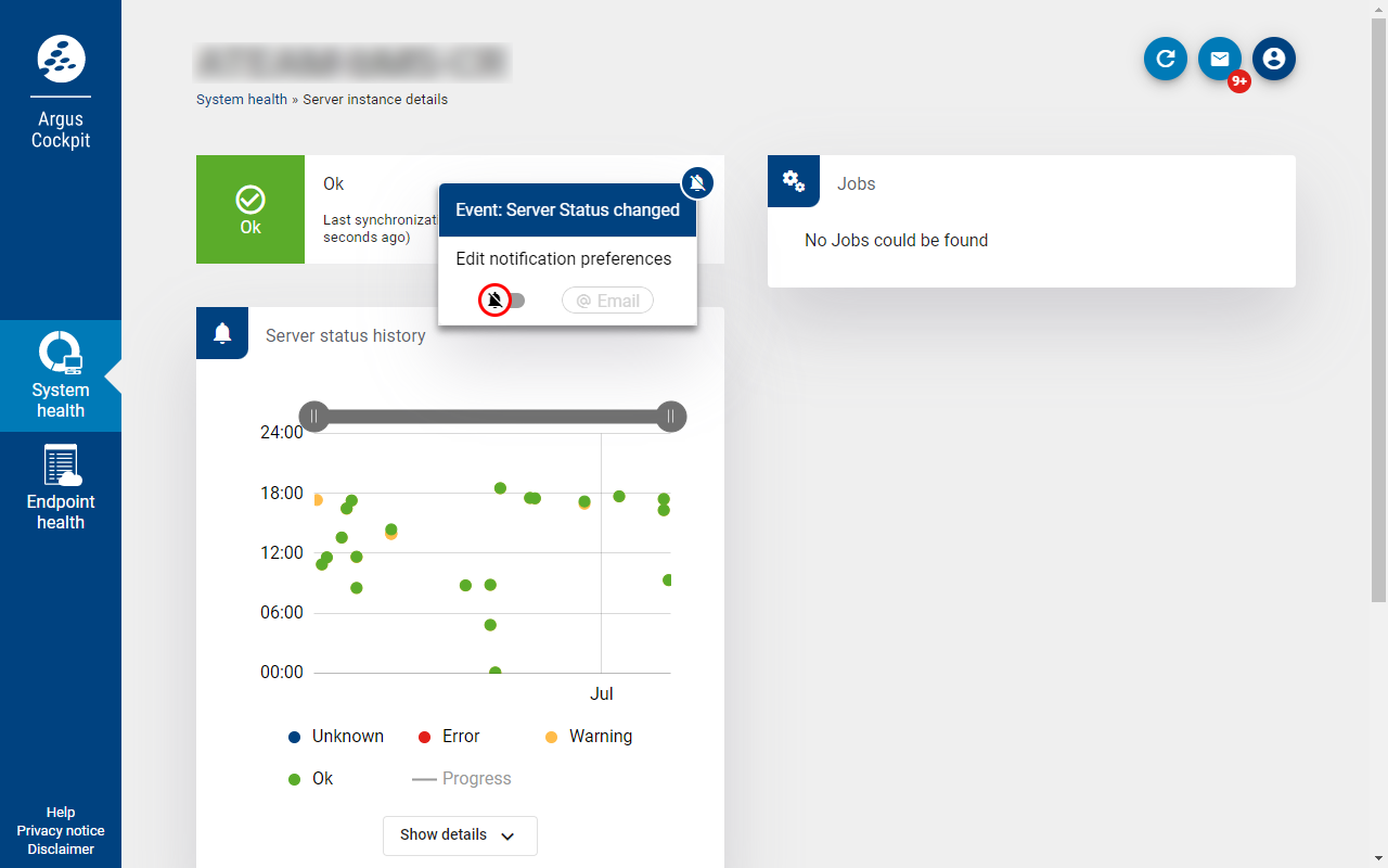 In der Kachel Serverstatus bearbeiten Sie über das Glockensymbol oben rechts die Einstellungen zu den Benachrichtigungen über Statuswechsel dieses Servers. Aktivieren oder deaktivieren Sie Benachrichtigungen über das Glockensymbol und wählen Sie zusätzlich über den E-Mail-Button, ob Sie E-Mail-Benachrichtigungen erhalten möchten.