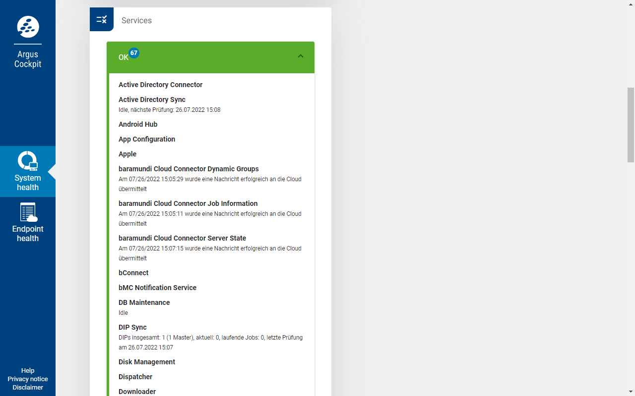 Im Bereich Services sind alle auf dem Server laufenden Services gelistet, einschließlich der deaktivierten Services (falls vorhanden, in eigener Liste).