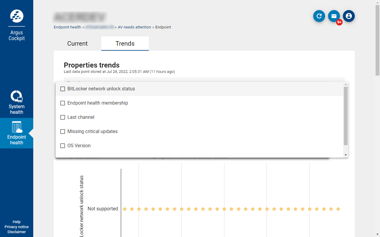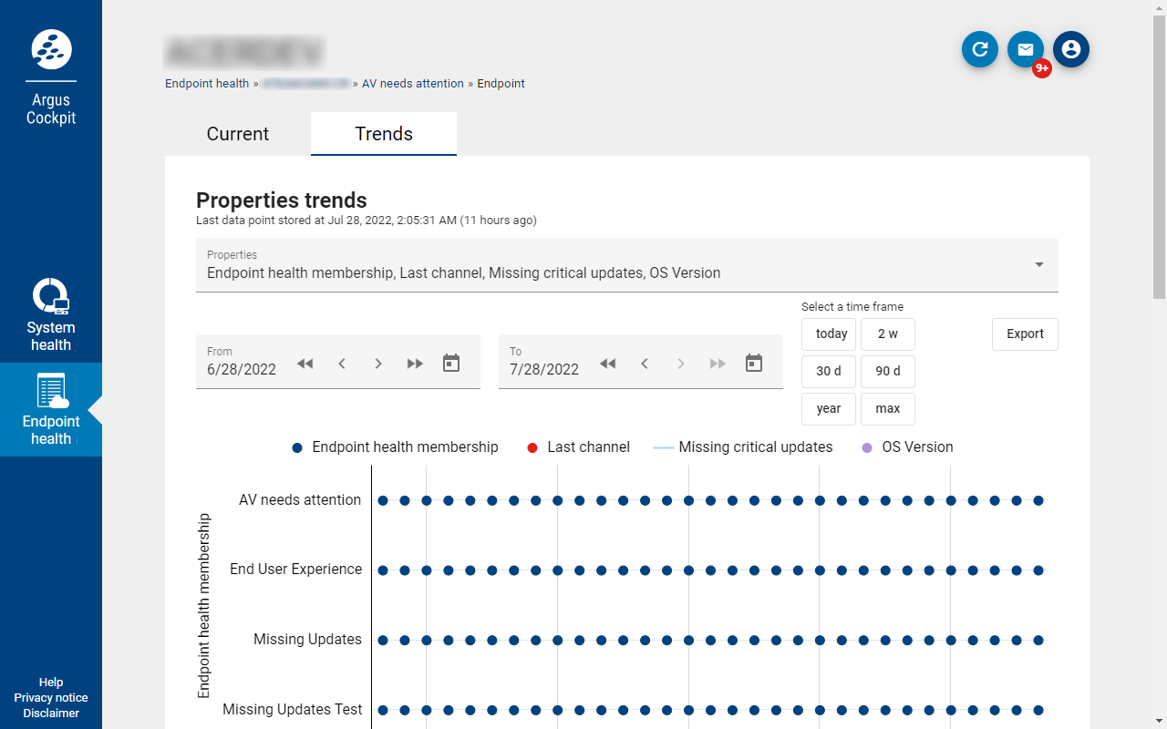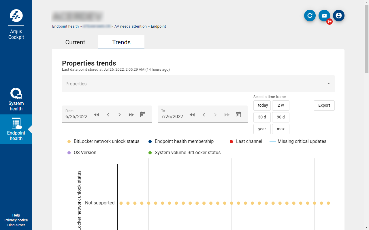 Argus Cockpit erlaubt Ihnen, historische Daten von Endpoints eines Unternehmens einzusehen. Somit können Sie den «Gesundheitsstatus» einer Umgebung über einen längeren Zeitraum aufzeichnen und die Ergebnisse mit Ihren Kunden/Vorgesetzten teilen. So können Sie zum Beispiel darstellen, welche Endpoints in letzter Zeit wenig Speicherplatz zur Verfügung hatten. Sie können Nachweise über eine erfolgreiche Aktivierung von BitLocker auf allen Endpoints führen, oder Sie zeigen auf, wie sich der Zustand von Endgeräten bezüglich fehlender kritischer Updates in den letzten vier Wochen entwickelte. Insbesondere für ein bevorstehendes Security-Audit oder Reporting sind diese Informationen hilfreich.