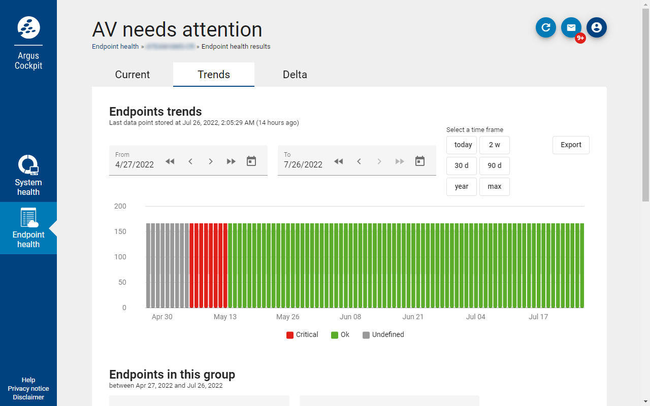 Die Trends-Darstellung funktioniert von dem Tag an, ab dem die Daten der Dynamischen Gruppe aus der bMC in die Cloud synchronisiert worden sind. In der Übersicht Endpoint Health sehen Sie unter Ihrem Servernamen den Hinweis active: trends.