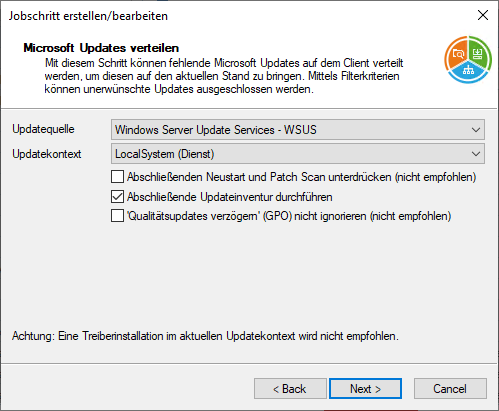 Alle am Endgerät relevanten Aktionen sind im Jobschritt Microsoft Updates verwalten zusammengefasst. Dort können sowohl eine Inventur als auch die Aktualisierung ausgewählt werden.