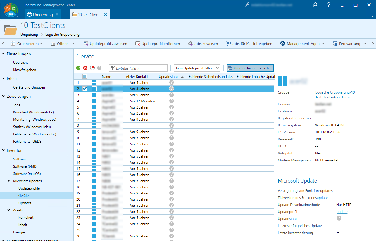So lassen sich einzelne Gruppen (z. B. Abteilungen) aber auch verschachtelte Zweige (z. B. Standorte) gezielt auswerten. Auf einen Blick ist erkennbar, ob die Geräte die Vorgaben des Updateprofils erfüllen, ob und wie viele Updates fehlen und auch wann zuletzt inventarisiert bzw. aktualisiert wurde. Selbstverständlich kann auch auf die verschiedenen Zustände und die Updateprofile gefiltert werden.