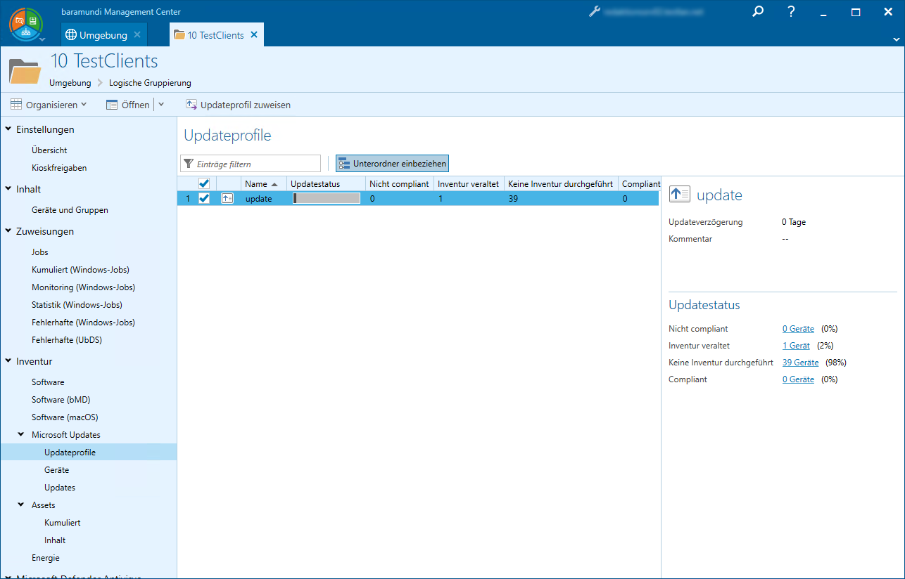 Die Auflistung der Updateprofile an den logischen Gruppen finden Sie unter Umgebung > {Logische Gruppe} > Inventur > Microsoft Updates > Updateprofile. Öffnen Sie dazu mit Rechtsklick die logische Gruppe in einem neuen Tab.