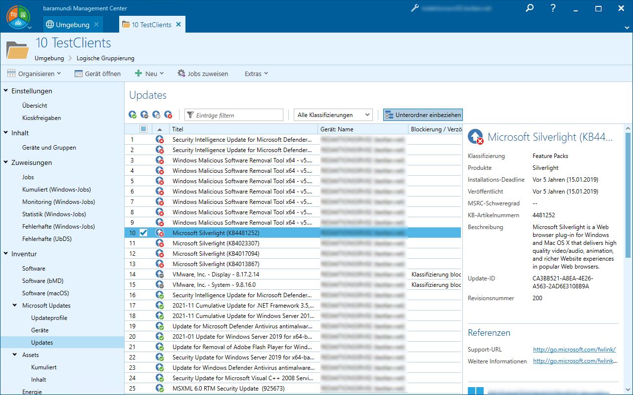 Die Auflistung aller referenzierter Updates innerhalb einer Gruppe und darunterliegender Gruppen (Rechtsklick > Gruppe in neuem Tab öffnen) finden Sie unter Umgebung > {Logische Gruppe} > Inventur > Microsoft Updates > Updates.