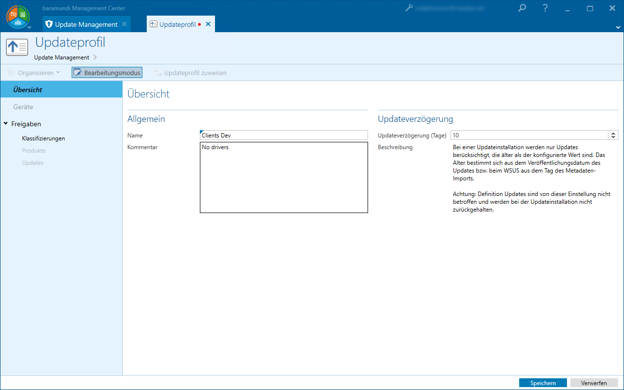 Zunächst werden die für das eigene Unternehmen relevanten Ringe anhand eigener Kriterien definiert. Anschließend werden die zur Abbildung der Ringe benötigten Updateprofile in der baramundi Management Suite angelegt. Hierbei sollten aussagekräftige Namen und gegebenenfalls ergänzende Kommentare verwendet werden. Ebenso wird die Verzögerung der Updates in Tagen angegeben.
