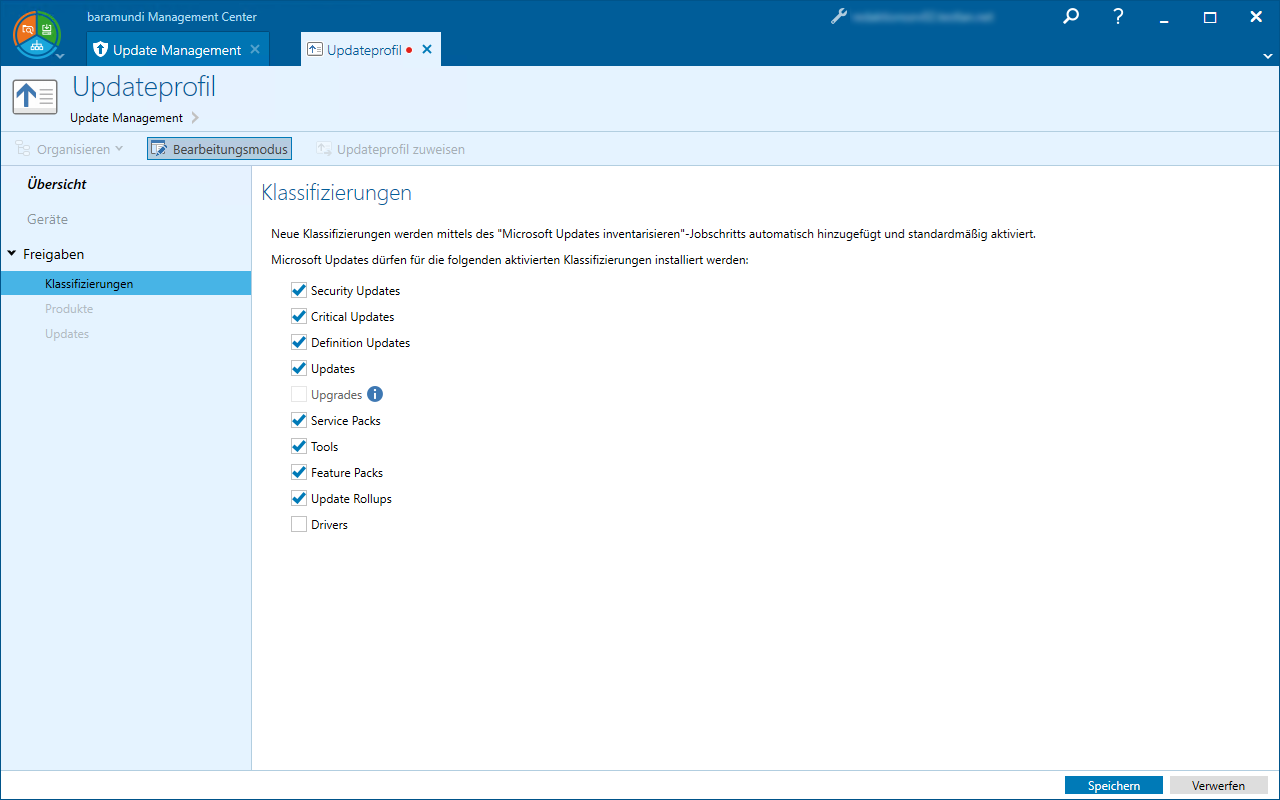 Im nächsten Schritt werden die generell freigegebenen Klassifizierungen bestimmt. Aus Gründen der Sicherheit – und um ein möglichst durchgehend aktuelles System zu gewährleisten – sollten nach Möglichkeit alle Klassifizierungen freigegeben sein. Eine Ausnahme stellen bei dieser Empfehlung die Klassifizierungen Upgrades und Drivers dar.