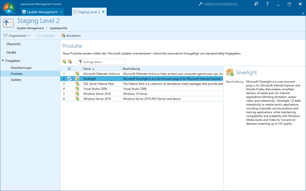 Sollte beispielsweise Microsoft Silverlight grundsätzlich nicht auf Unternehmensrechnern installiert und aktualisiert werden, so kann dieses Produkt im Updateprofil als geblockt markiert und somit von der Verteilung ausgenommen werden.