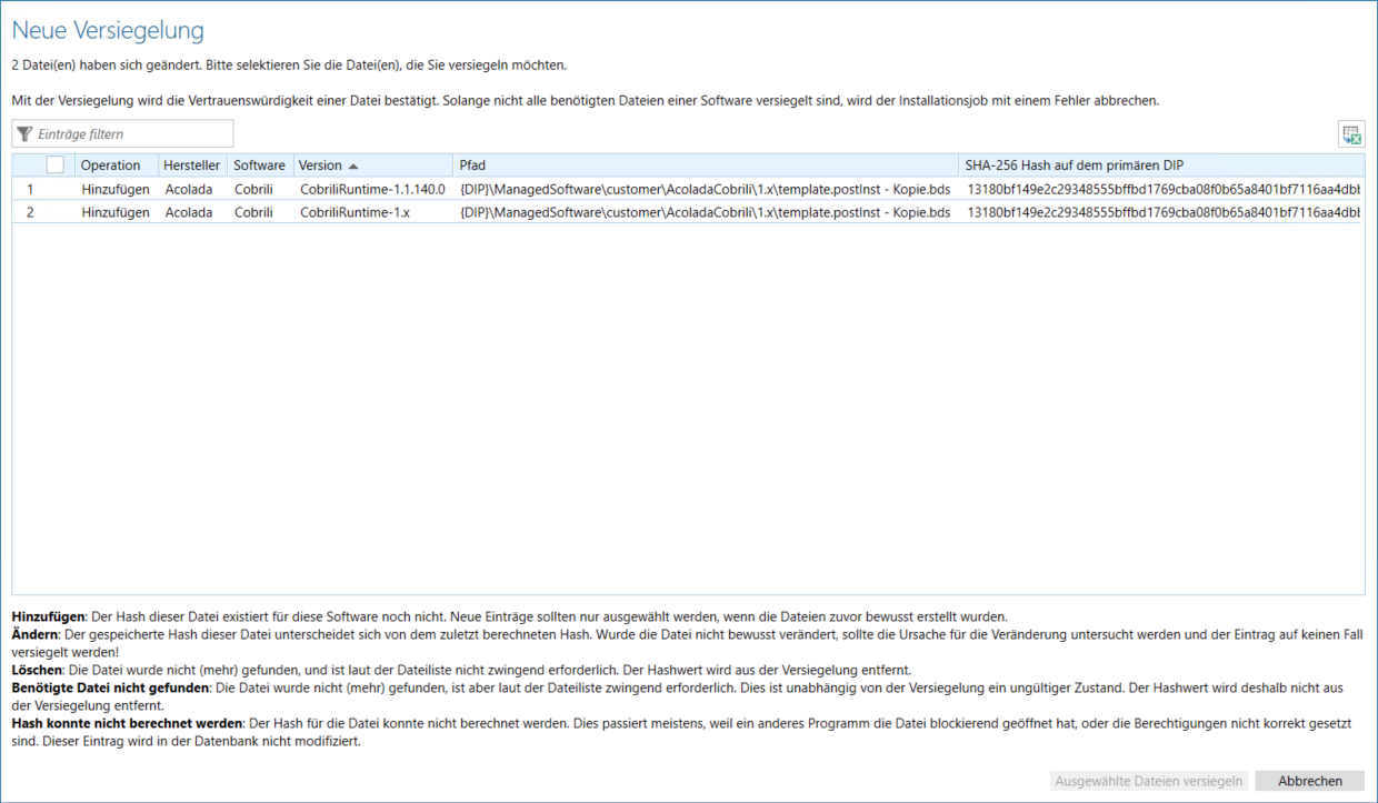 Änderungen gefunden: Wurden Unterschiede in den Dateien aus Dateisystem und Datenbank gefunden oder waren Dateien nicht auffindbar, öffnet sich der Dialog Neue Versiegelung. Hier entscheiden Sie, ob Sie die angegebene Operation (Hinzufügen, Ändern, Löschen) übernehmen wollen. Die Operationen Benötigte Datei nicht gefunden und Hash konnte nicht berechnet werden sind Fehlerzustände und bewirken keine Änderung, wenn sie ausgewählt werden. Hash-Einträge mit deaktivierter Dateivalidierung werden hier nicht mehr angezeigt.