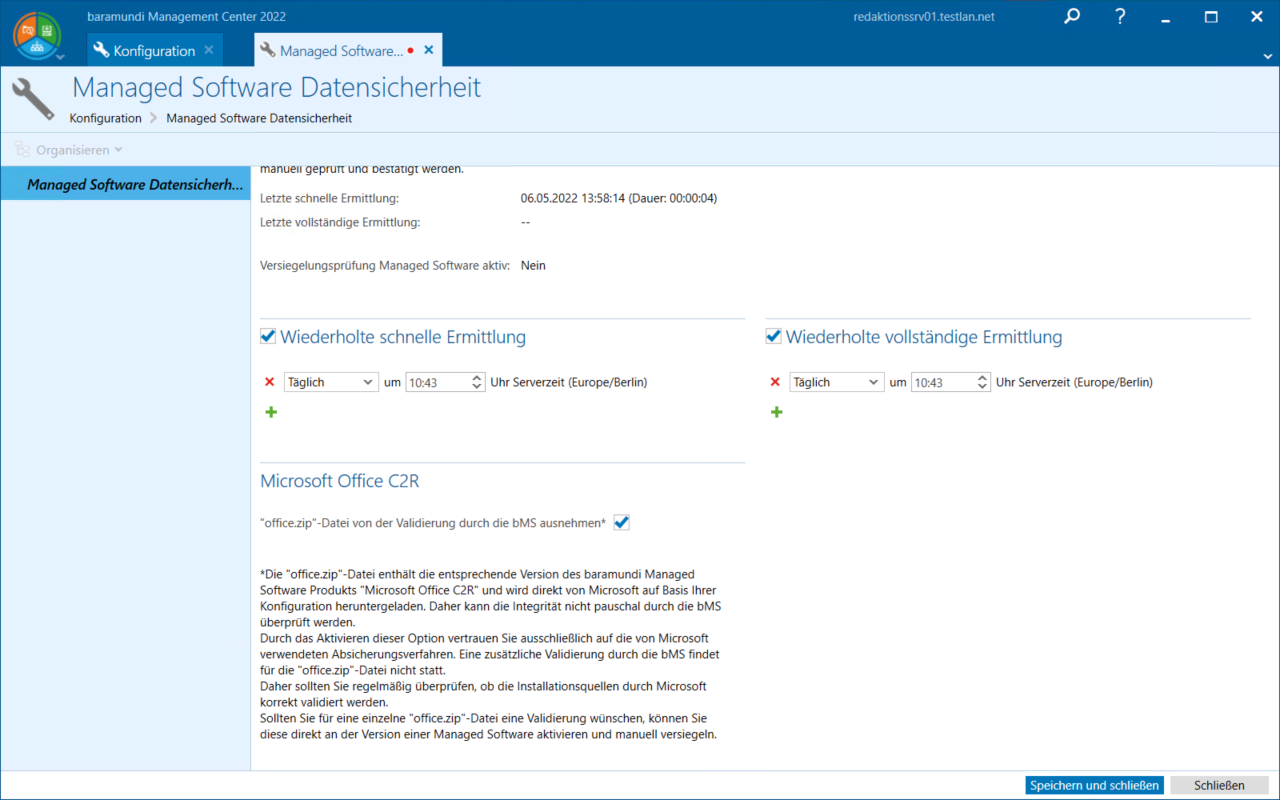 Eine Sonderrolle bei der Versiegelung nimmt die Managed Software «Microsoft Office C2R», bzw. die Datei office.zip ein. Da der Inhalt sehr unterschiedlich sein kann und diese Datei nicht von baramundi, sondern von Microsoft direkt kommt, kann die Versiegelung nicht automatisch erfolgen. Die Datei kann nach dem Download mittels C2R manuell versiegelt werden. Eine (geplante) schnelle Ermittlung findet die Datei ebenfalls. Alternativ ermöglicht die Checkbox das Ausnehmen der Datei von der Validierung (Aktivieren der Checkbox über die Aktion Bearbeiten). Dabei wird für alle aktuell vorhandenen und zukünftigen Hashes von office.zip-Dateien die Validierung deaktiviert, sofern der entsprechende Hash-Eintrag vorher nicht bereits von einem Benutzer manuell bearbeitet wurde. Die Validierung kann im Tab Versiegelung manuell wieder aktiviert werden.