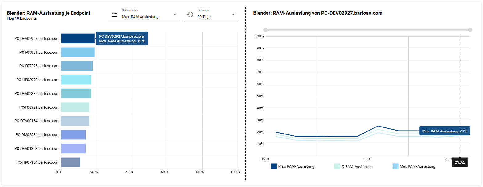 Unabhängig von der Sortierung steht der größte Wert immer ganz oben. Die x-Achse zeigt den Wert der RAM-Auslastung. Wählen Sie den gewünschten Zeitraum, über den die Werte angezeigt werden sollen, oben rechts. Standardmäßig wird der Zeitraum des Bereichs Messung übernommen.