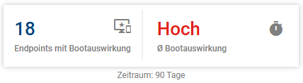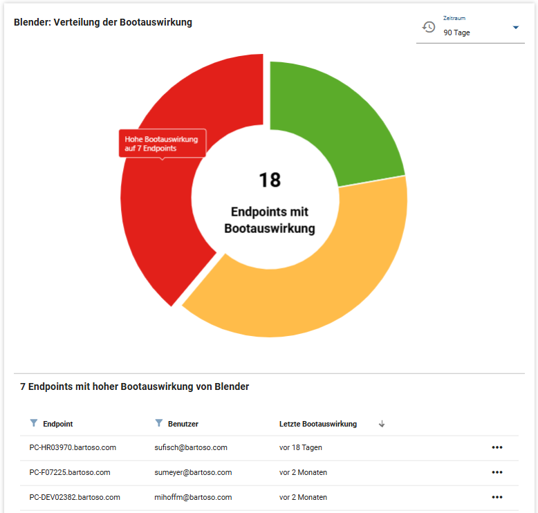 Das Diagramm zeigt Ihnen auf einen Blick wie sich die Bootauswirkung dieser Applikation im gewählten Zeitraum auf alle Endpoints verteilt hat, auf denen sie installiert ist oder war. Um zu sehen, welche Endpoints betroffen sind, wählen Sie eine Auswirkung im Diagramm (hoch, mittel oder niedrig). Unterhalb des Diagramms erscheint eine Liste mit den entsprechenden Endpoints und deren Details (Endpointbezeichnung, Benutzer sowie der Zeitpunkt der letzten Bootauswirkung). Durch Klick auf den Endpoint oder über das Drei-Punkte-Menü auf der rechten Seite öffnen Sie den Endpoint in seiner Detailansicht.