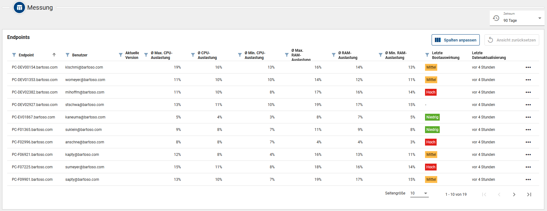 Im Bereich Messung sehen Sie alle Endpoints der von Ihnen gewählten Umgebung gelistet, auf denen die gewählte Applikation installiert ist, standardmäßig sortiert nach dem Namen des Geräts. Den Zeitraum wählen Sie oben rechts.