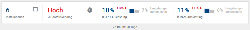 Ganz oben sehen Sie eine Zusammenfassung der Daten (Anzahl der Installationen, durchschnittliche Bootauswirkung, durchschnittliche CPU- und RAM-Auslastung) für den Endpoint im ausgewählten Zeitraum. Den Zeitraum wählen Sie ganz oben rechts im Bereich Messung.