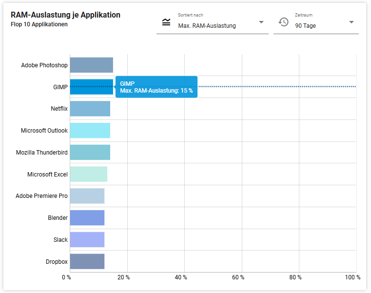 Unabhängig von der Sortierung steht der größte Wert immer ganz oben. Die x-Achse zeigt den Wert der RAM-Auslastung. Wählen Sie den gewünschten Zeitraum, über den die Werte angezeigt werden sollen, oben rechts. Standardmäßig wird der Zeitraum des Bereichs Messung übernommen.