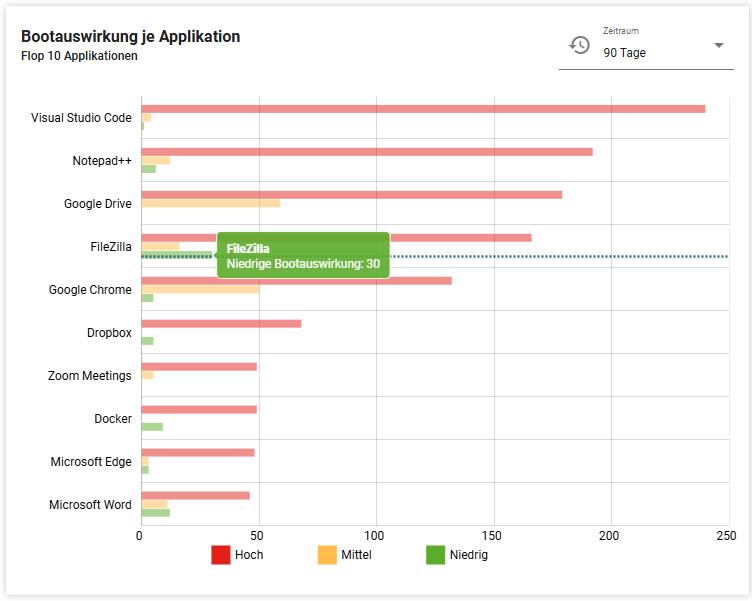 Diese Grafik zeigt Ihnen eine Übersicht der Flop 10 Applikationen, die im gewählten Zeitraum die größte Bootauswirkung auf dem Endpoint hatten. Über einen Klick auf einen Balken gelangen Sie zur Detailansicht der Applikation.