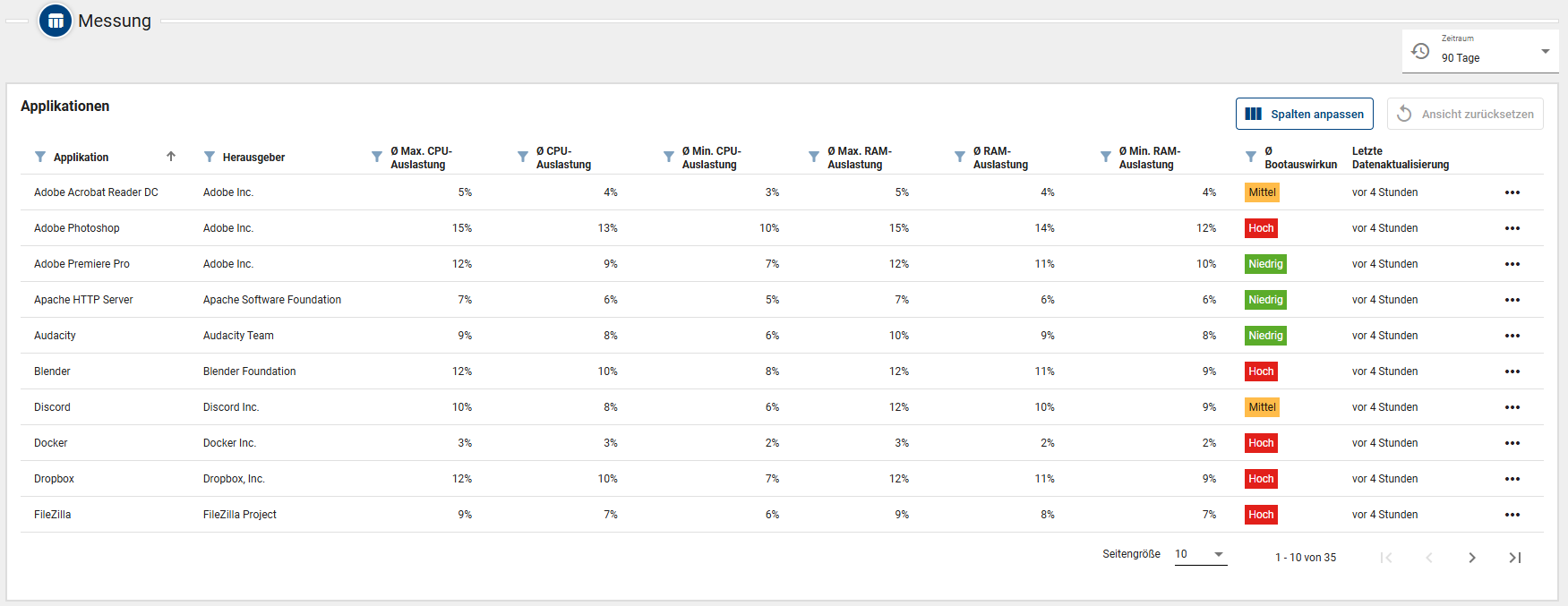 Im Bereich Messung sehen Sie alle Applikationen der von Ihnen gewählten Umgebung gelistet, standardmäßig sortiert nach der durchschnittlichen CPU-Auslastung. Den Zeitraum wählen Sie oben rechts.