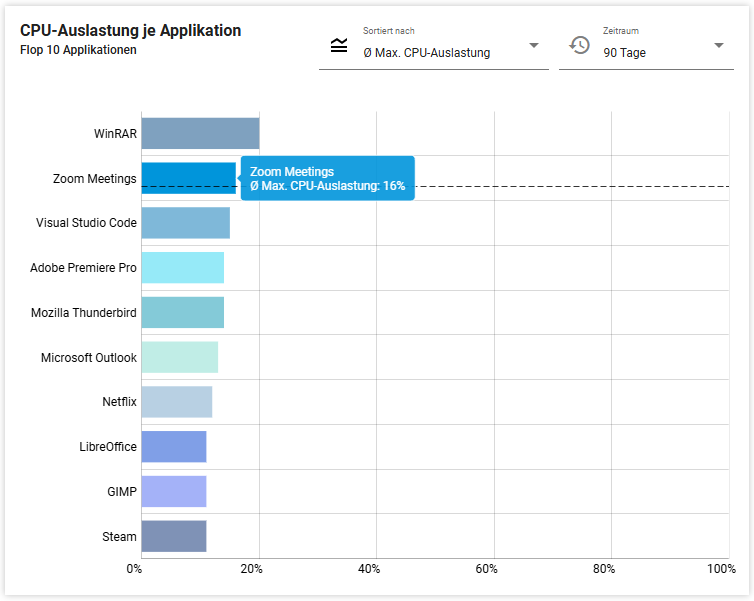 Unabhängig von der Sortierung steht der größte Wert immer ganz oben. Die x-Achse zeigt den Wert der CPU-Auslastung. Wählen Sie den gewünschten Zeitraum, über den die Werte angezeigt werden sollen, oben rechts. Standardmäßig wird der Zeitraum des Bereichs Messung übernommen.