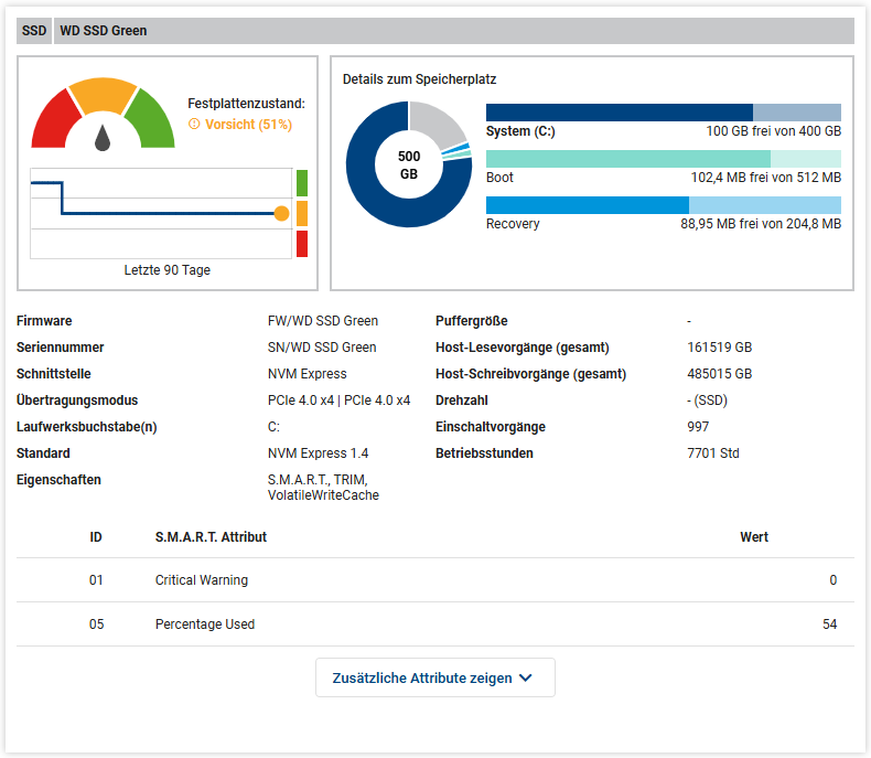 Die Attribute sind sortiert nach Wichtigkeit und abhängig vom Festplattenhersteller. Über einen Button unterhalb der Tabelle können Sie sich Zusätzliche Attribute zeigen lassen oder die Tabelle aus dem aufgeklappten Zustand wieder einklappen.
