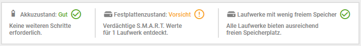 In der zweiten Überblickskachel sehen Sie den aktuellen Zustand (letzte Daten) von Akku, Festplatten und Speicherplatz. Ein Hinweis zu den jeweiligen Werten sagt Ihnen, ob eine Handlung empfohlen wird.