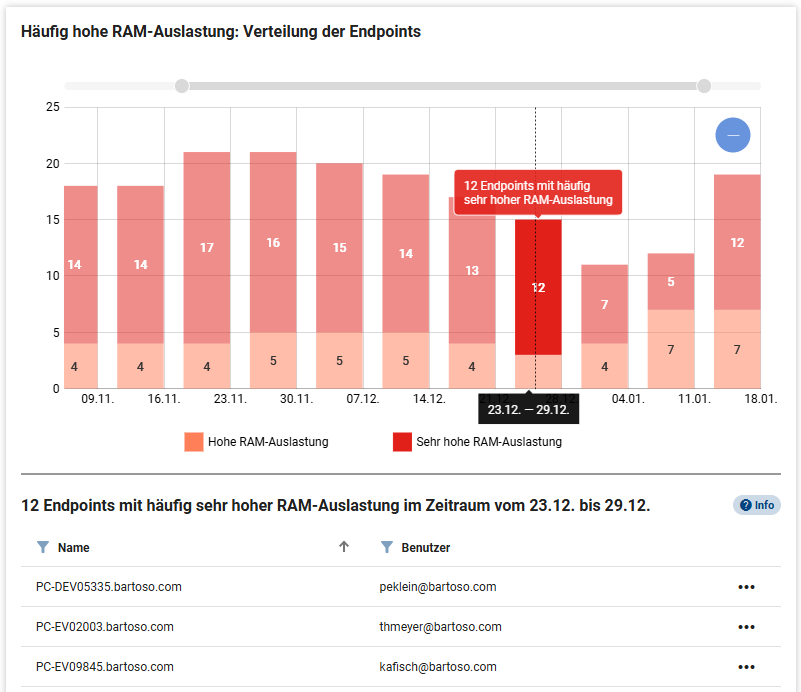 Häufig hohe RAM-Auslastung: Verteilung der Endpoints: Die Grafik zeigt Ihnen diejenigen Endpoints, welche von häufig sehr hoher oder hoher RAM-Auslastung betroffen sind. Der Zeitraum erstreckt sich immer über die vergangenen 90 Tage. Die einzelnen Balken zeigen immer den Durchschnittswert einer Woche bzw. von sieben Tagen (Montag bis Sonntag). Innerhalb der Balken sehen Sie die Verteilung zwischen den beiden Auslastungsstufen (hoch/sehr hoch). Verändern Sie die zeitliche Ansicht, indem Sie das Mausrad oder den grauen Zoombalken am oberen Rand der Grafik nutzen, um ein- oder auszuzoomen. Das blaue Minus-Icon setzt den Zoom-Zustand wieder zurück auf den vollen Zeitraum. Details: Sobald Sie einen Balken und dessen Bereich (hoch/sehr hoch) im Diagramm auswählen, sehen Sie unterhalb der Grafik eine Liste mit den in diesem Zeitraum betroffenen Endpoints. Von dieser Liste können Sie direkt zu den Detailansichten der einzelnen Endpoints navigieren oder diese über das Drei-Punkte-Menü in einem neuen Tab öffnen.