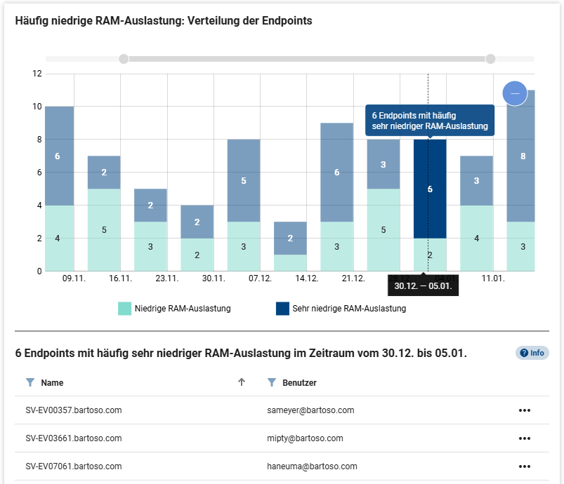 Häufig niedrige RAM-Auslastung: Verteilung der Endpoints: Die Grafik zeigt Ihnen diejenigen Endpoints, welche von häufig sehr niedriger oder niedriger RAM-Auslastung betroffen sind. Der Zeitraum erstreckt sich immer über die vergangenen 90 Tage. Die einzelnen Balken zeigen immer den Durchschnittswert einer Woche bzw. von sieben Tagen (Montag bis Sonntag). Innerhalb der Balken sehen Sie die Verteilung zwischen den beiden Auslastungsstufen (hoch/sehr hoch). Verändern Sie die zeitliche Ansicht, indem Sie das Mausrad oder den grauen Zoombalken am oberen Rand der Grafik nutzen, um ein- oder auszuzoomen. Das blaue Minus-Icon setzt den Zoom-Zustand wieder zurück auf den vollen Zeitraum. Details: Sobald Sie einen Balken und dessen Bereich (hoch/sehr hoch) im Diagramm auswählen, sehen Sie unterhalb der Grafik eine Liste mit den in diesem Zeitraum betroffenen Endpoints. Von dieser Liste können Sie direkt zu den Detailansichten der einzelnen Endpoints navigieren oder diese über das Drei-Punkte-Menü in einem neuen Tab öffnen.
