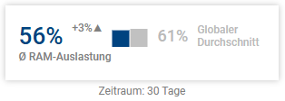 Die Übersichtskachel zeigt Ihnen die durchschnittliche RAM-Auslastung der gewählten Endpoints. Diese wird verglichen mit dem globalen Durchschnitt, also der durchschnittlichen RAM-Auslastung aller in baramundi perform2work erfassten Umgebungen. Der Trend ist dargestellt mit der kleinen Zahl (s. Tooltip).