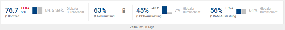 Bootzeit: Die durchschnittliche Bootzeit der gewählten Endpoints wird verglichen mit dem globalen Durchschnitt, also der durchschnittlichen Bootzeit aller in baramundi perform2work erfassten Umgebungen. Der Trend ist dargestellt mit der kleinen Zahl (s. Tooltip).