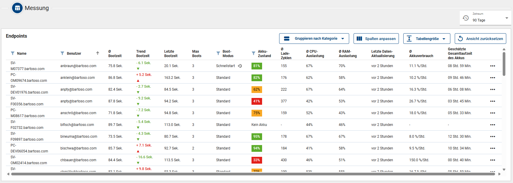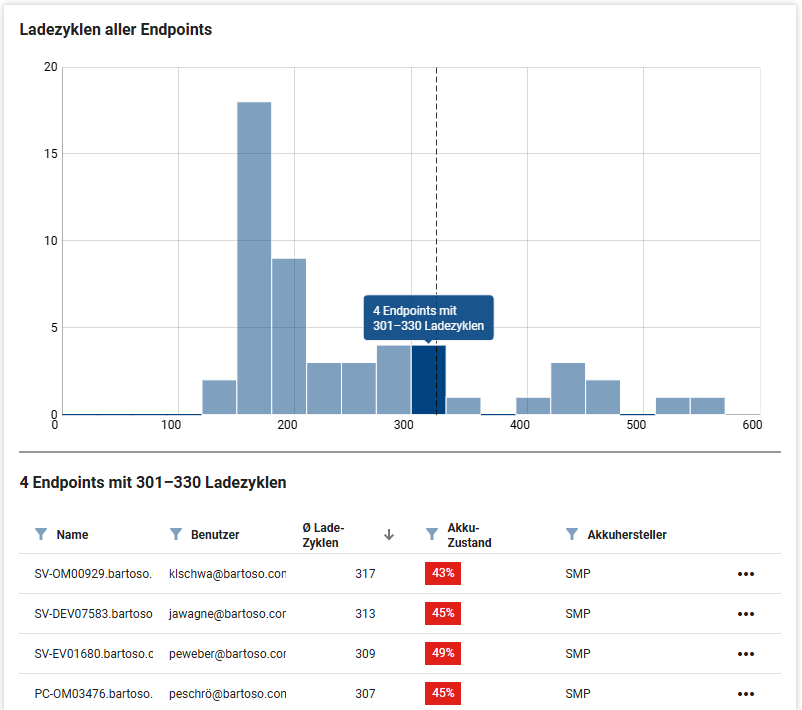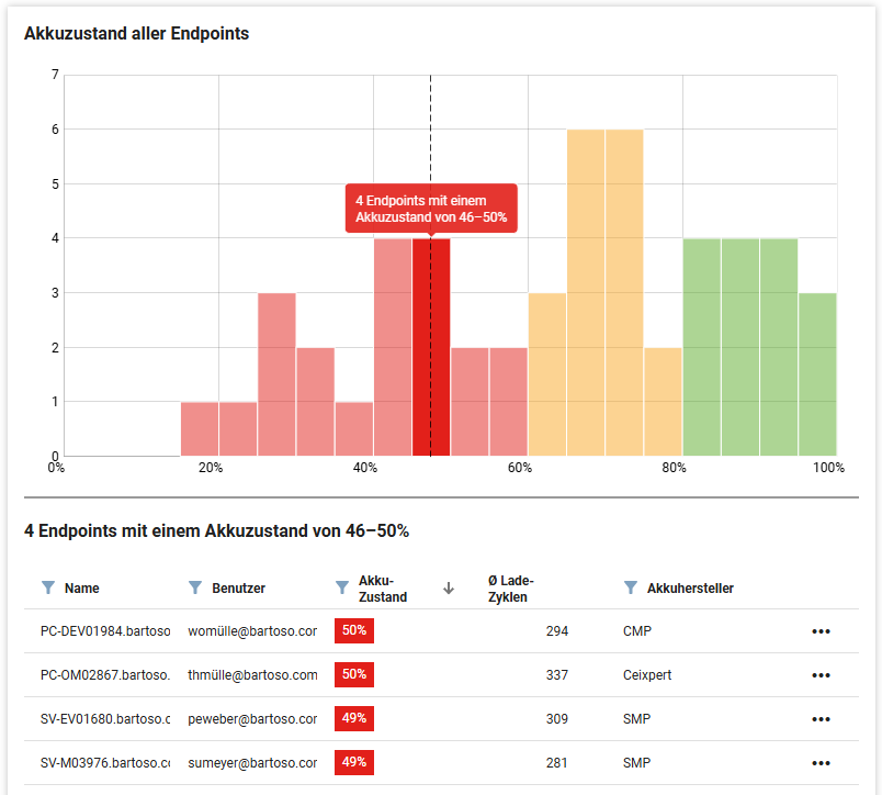 Akkuzustand aller Endpoints: Hier sehen Sie die Verteilung aller Endpoints auf ihren durchschnittlichen Akkuzustand in einem Balkendiagramm. Durch Klick auf einen Balken öffnen sich die Details unterhalb des Diagramms: Sie sehen dann die Liste mit den entsprechenden Endpoints, die in den gewählten Bereich fallen, einschließlich ihres genauen Akkuwertes sowie der Anzahl der Ladezyklen und dem Akkuhersteller. Der Klick auf einen der Endpoints bringt Sie zur entsprechenden Detailansicht.